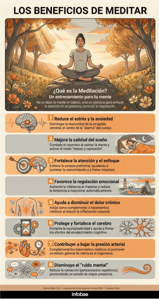 La ciencia ha demostrado en estudios que la meditación ayuda a mejorar la función cognitiva e incluso a aumentar la materia gris cerebral; también puede reducir el estrés y el riesgo de enfermedades cardiovasculares.